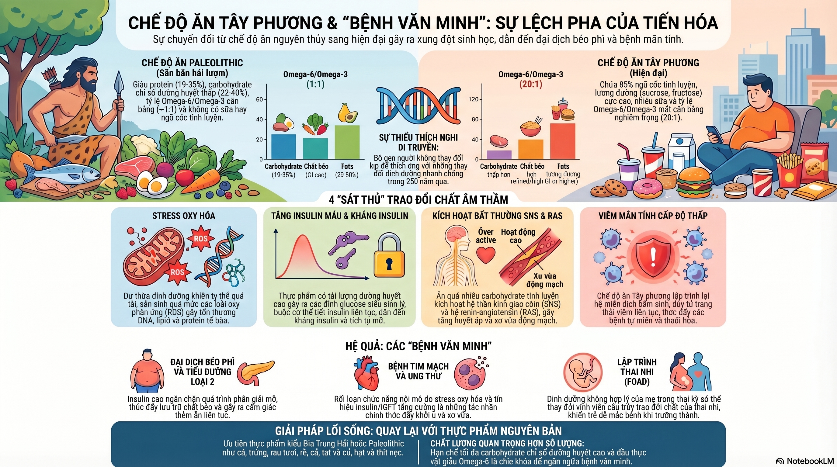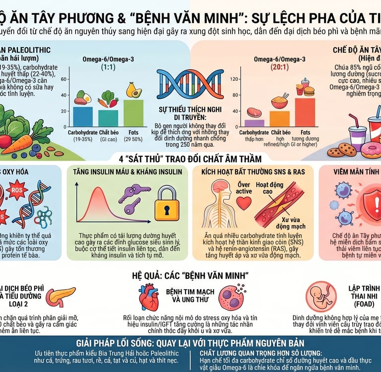 Chỉ trong khoảng 6–8 thế hệ, đặc biệt là sự tăng tốc đáng báo động trong 2–3 thế hệ gần đây, nhân loại đã chứng kiến một bước ngoặt y tế nghiệt ngã. Nếu đầu thế kỷ 20, kẻ thù chính là các bệnh truyền nhiễm, thì thế kỷ 21 lại bị thống trị bởi các "bệnh văn minh": béo phì, đái tháo đường type 2 (T2DM), ung thư và Alzheimer. Tại sao y học hiện đại đạt được những thành tựu rực rỡ nhưng chúng ta lại ngày càng trở nên yếu ớt? Câu trả lời không nằm ở sự thiếu hụt thuốc men, mà ở sự xung đột gay gắt giữa lối sống hiện đại và bản thiết kế sinh học đã được tinh chỉnh qua hàng triệu năm tiến hóa.