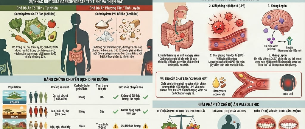 Ngược lại, hãy nhìn vào người Pima. Những người Pima sống tại Mexico với chế độ ăn truyền thống chỉ có tỷ lệ béo phì khoảng 7-20%. Nhưng khi người Pima ở Arizona (Mỹ) chuyển sang chế độ ăn Phương Tây đầy bột mì và đường phi tế bào, tỷ lệ béo phì đã vọt lên 64-75%. Đây chính là "bằng chứng thép" cho thấy: cấu trúc của carbohydrate quan trọng hơn tổng lượng calo.