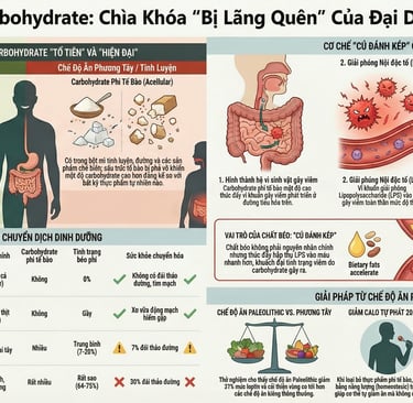 Khi hệ vi sinh vật đã bị biến đổi do tinh bột phi tế bào, việc tiêu thụ thêm chất béo (đặc biệt là chất béo tinh luyện) sẽ tạo ra một "cú đánh kép". Chế độ ăn nhiều chất béo làm giảm biểu hiện của các protein liên kết chặt (tight junction proteins) – vốn là những "mối hàn" giữ cho thành ruột khép kín. Khi các mối hàn này bị lỏng lẻo, "rác thải vi khuẩn" LPS sẽ dễ dàng tràn vào máu hơn. Điều này giải thích tại sao chế độ ăn ít carb (low-carb) lại hiệu quả hơn hẳn ít béo (low-fat) trong việc giảm cân tự phát: bằng cách loại bỏ carb phi tế bào, chúng ta đã khóa chặt nguồn cơn gây viêm ngay từ đầu.